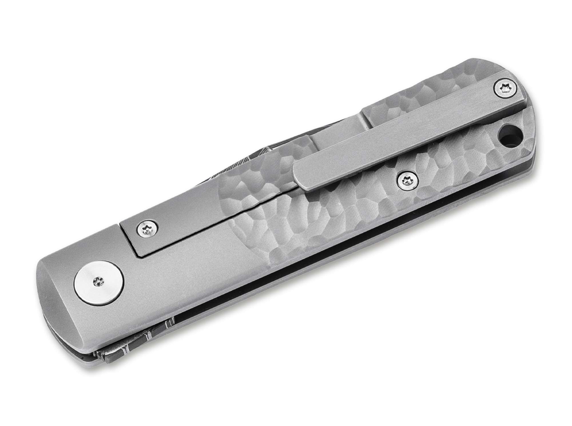 Das Böker BRLW Meteoritendamast kombiniert außergewöhnliches Design mit exklusiven Materialien. Die handgeschmiedete Clippoint-Klinge aus Meteoritendamast von Chad Nichols beeindruckt mit ihrem einzigartigen Muster. Der präzisionsgefräste Titangriff greift die Form klassischer Barlow-Modelle auf und verleiht dem Messer eine besondere Haptik. Ein diskret integrierter Framelock sorgt für sichere Verriegelung, während der versteckte Flipper und der elegante Titan-Clip das Design abrunden.