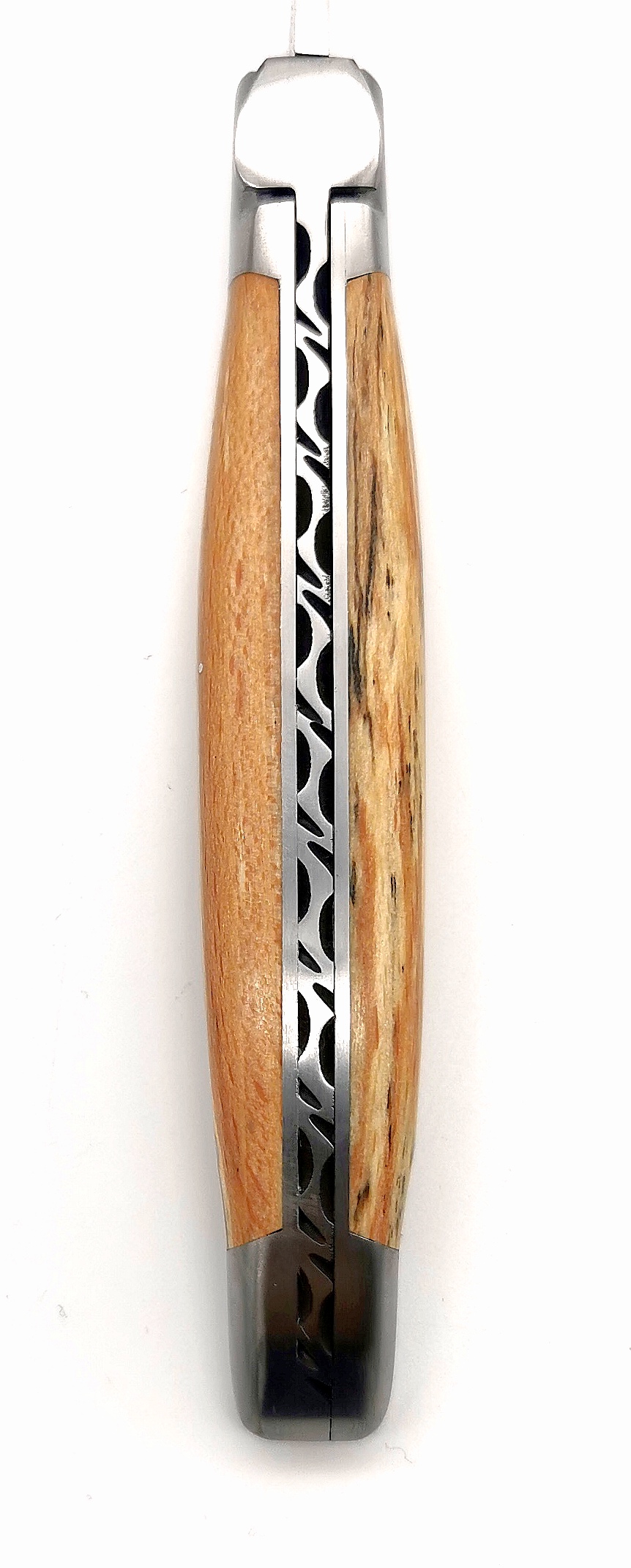 Das Taschenmesser von Laguiole Village überzeugt mit stabilisierten Griffschalen aus Buche, die besonders langlebig und elegant sind. Feder und Platine sind kunstvoll von Hand verziert (Guillochage), die Feder und die Biene wurden aus einem Stück geschmiedet. Die Klinge besteht aus 14C28N Stahl, der für seine guten Schnitteigenschaften bekannt ist. Ein besonderes Detail ist die Blanko-Biene, die individuell mit einem Wunschmotiv per Lasergravur versehen werden kann.