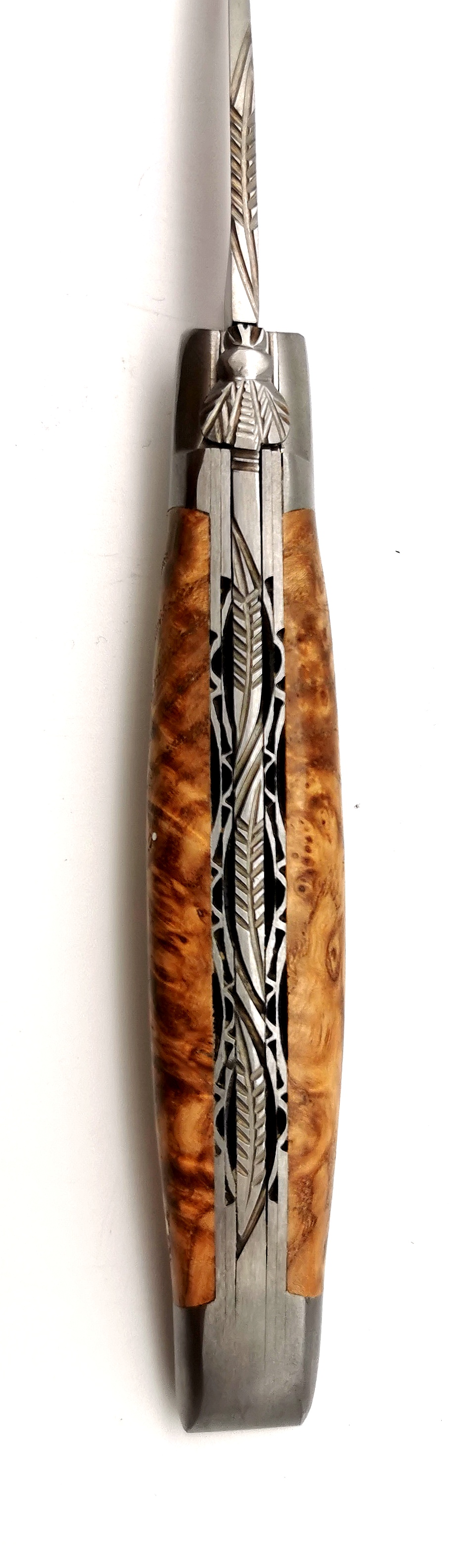 Dieses Taschenmesser von Laguiole en Aubrac vereint hochwertige Materialien mit echter Handwerkskunst. Die Griffschalen aus Eschen Wurzelholz verleihen dem Messer einen natürlichen und individuellen Look. Die robuste Klinge aus rostfreiem 12c27 Stahl sorgt für langanhaltende Schärfe und Zuverlässigkeit. Die Doppelplatine bietet zusätzliche Stabilität und wird, ebenso wie die Feder, sorgfältig von Hand verziert. Die Fliege und die Feder, beide aus einem Stück gefertigt, sind ein Zeichen für die präzise und liebevolle Herstellung. Dieses Messer steht für Qualität, Tradition und zeitloses Design.