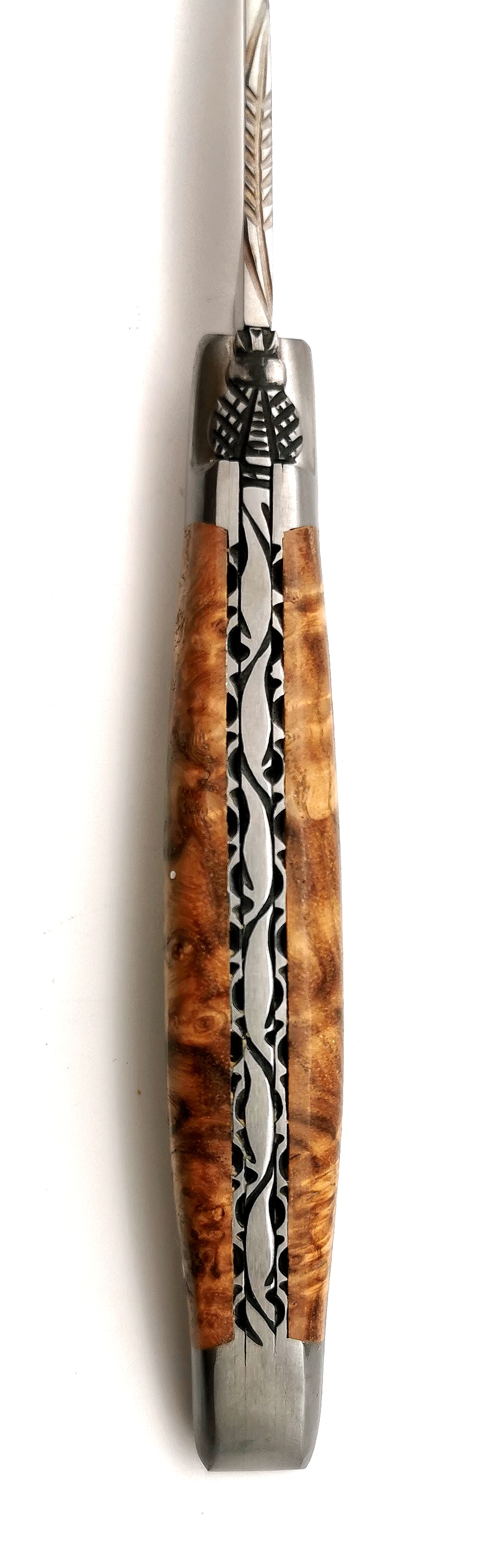 Erleben Sie echte Handwerkskunst diesem Taschenmesser von Laguiole en Aubrac. Die Griffschalen aus Eschen Wurzelholz verleihen jedem Messer einen natürlichen und einzigartigen Look. Die Klinge aus rostfreiem 12c27 Stahl überzeugt durch ihre Schärfe und Langlebigkeit. Die Feder und die Fliege sind aus einem Stück gefertigt, was die besondere Qualität und Sorgfalt bei der Herstellung unterstreicht. Die Feder wird zusätzlich kunstvoll per Hand verziert, was jedes Taschenmesser zu einem einzigartigen Meisterwerk macht.