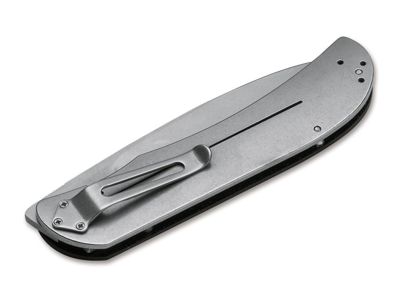Das Böker Plus Exskelibur ist bereits in zahlreichen Varianten erschienen. Diese hier hat einen Edelstahl-Framelock und ist flach gebaut. Für die Vorderschale kommt eine selbsttragende Schale aus G10 zum Einsatz. Sowohl der Griff als auch die flachgeschliffenen D2-Klinge sind alltagstauglich mit einem Stonewash-Finish versehen. So wird aus dem Exskelibur Framelock Steel ein echtes Gebrauchsmesser. Zusätzlich ist dieses Messer mit einem umsetzbarem Clip ausgestattet.