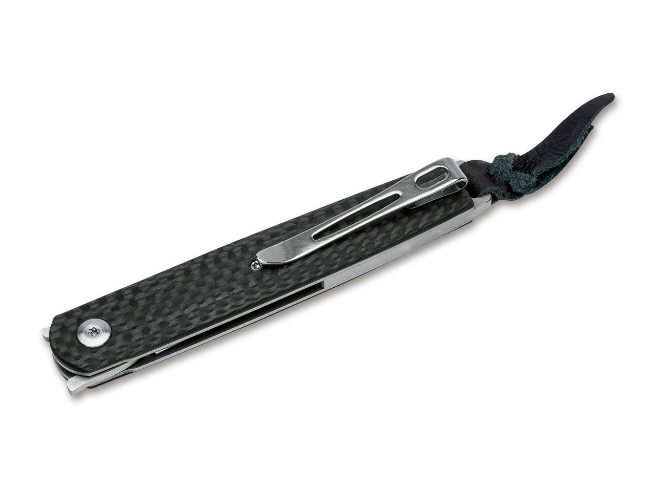 Mit dem Böker Plus LRF legt Böker ein Messer vor, dass das japanisch inspirierte Gentlemanmesser verkörpert. Die Klinge des LRF wird per Frontflipper geöffnet und bietet durch die Kugellagerung einen seidenweichen Gang. Die schlanke Bauweise basiert auf Edelstahlplatinen, die den Linerlock beherbergen. Der Clip (Tip-up/r) ermöglichen ein komfortables Tragen des Leichtgewichtes. Die Klinge aus VG-10 besitzt eine Längssatinierung, die mit den Griffschalen aus Kohlefaser harmoniert.