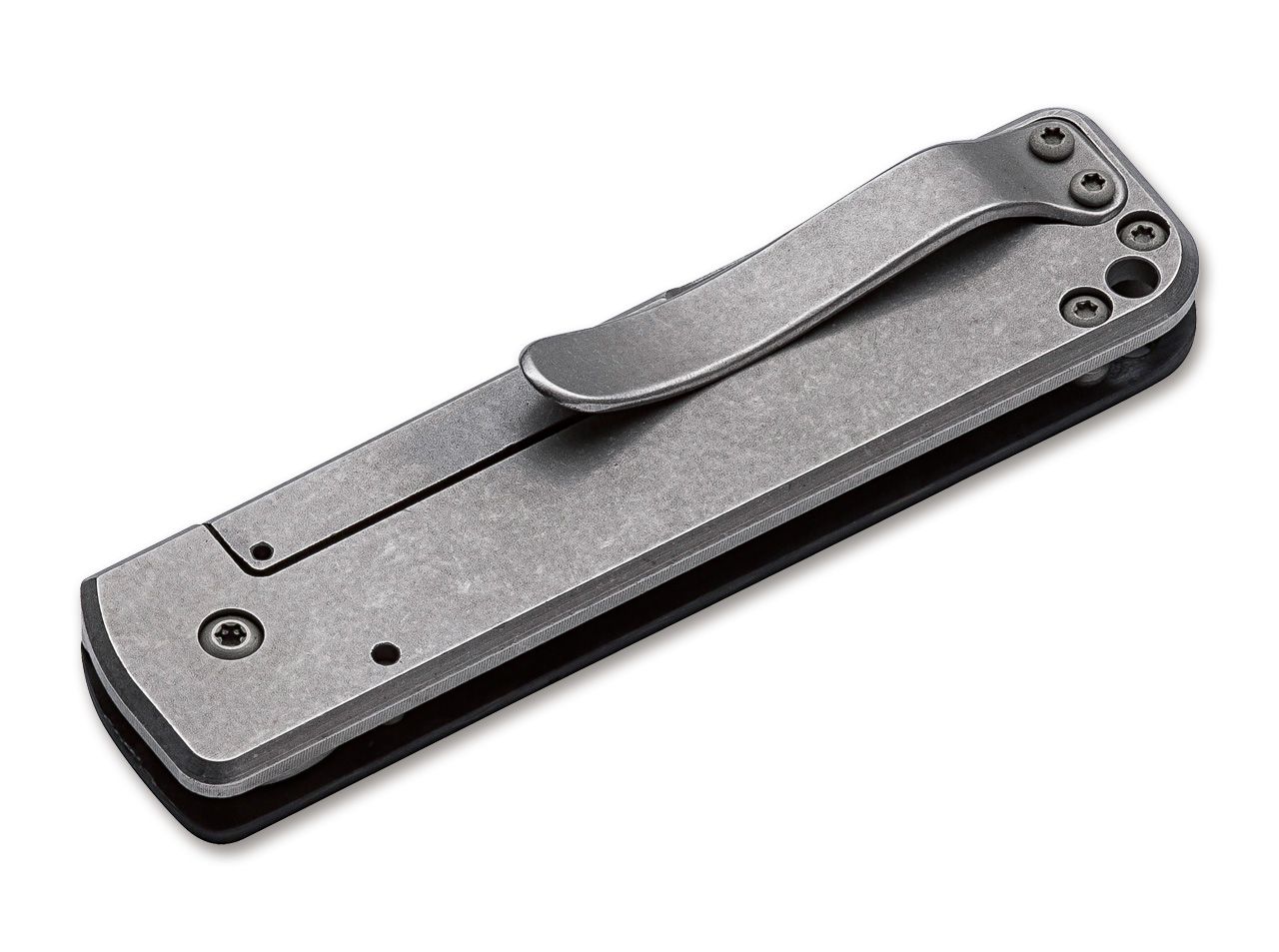 Das Böker Plus Lancer ist in der Zweihandversion mit einer Stonewash-Klinge aus D2 ausgestattet, die per Nagelhau geöffnet und von einem stabilen Framelock gesichert wird. Das Messer bietet dank der kompakten und sehr flachen Bauform einen extrem hohen Tragekomfort, während die stabile Bauweise Solidität und Robustheit ausstrahlt. Die vordere Griffschale besteht aus Kohlefaser, die Rückseite wird aus Edelstahl gefertigt und beherbergt den Framelock.Auf der Rückseite befindet sich ein Clip (Tip-up).
