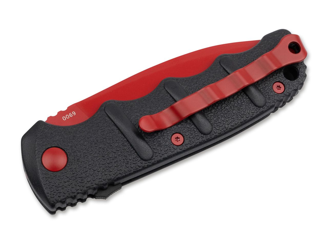 Bei dem Böker Plus AKS-74 aus der Kalashnikov-Serie sind Klinge und Schrauben der exklusiven Black Widow Edition mit einer roten Beschichtung versehen. Der schwarze Griff aus Aluminium erinnert stark an das Bajonett des berühmten Sturmgewehrs. Die rote Spearpoint-Klinge wird aus rostfreiem D2 gefertigt und kann zusätzlich zum Druckknopf per Schiebesicherung gesichert werden. Das Messer hat eine Fangriemenöse und einen praktischen Deep-Carry-Clip (Tip-up)