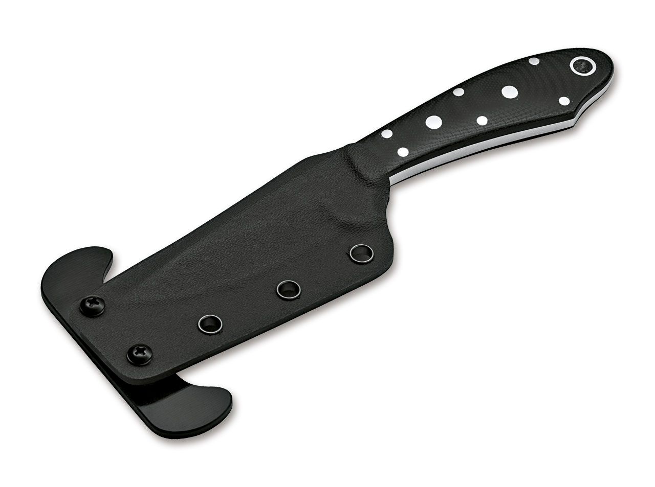 Das Böker Plus Backdrop überzeugt mit einem auf Geschwindigkeit und Flexibilität ausgelegten Konzept. Die passgenaue Kydexscheide kann mit dem beidseitigen Haken in der vorderen Hosentasche, mit der Lederplatte in der Gesäßtasche oder mit der Kugelkette als Neck Knife um den Hals getragen werden.Haken und Platte verhindern, dass die Scheide beim Ziehen des Messers ebenfalls aus der Tasche rutscht und gewährleisten so, dass das Messer stets einsatzbereit ist. Zudem lässt sich das frei mitführbare Backdrop dadurch genauso komfortabel und diskret tragen wie ein Klappmesser. Das handliche Messer ist mit einer satinierten Klinge aus D2 und Griffschalen aus schwarzem G10 ausgestattet, die mit dekorativen Nieten versehen sind. Die ergonomische Fingermulde und Riffelungen im Bereich der Daumenauflage erhöhen die Arbeitssicherheit.