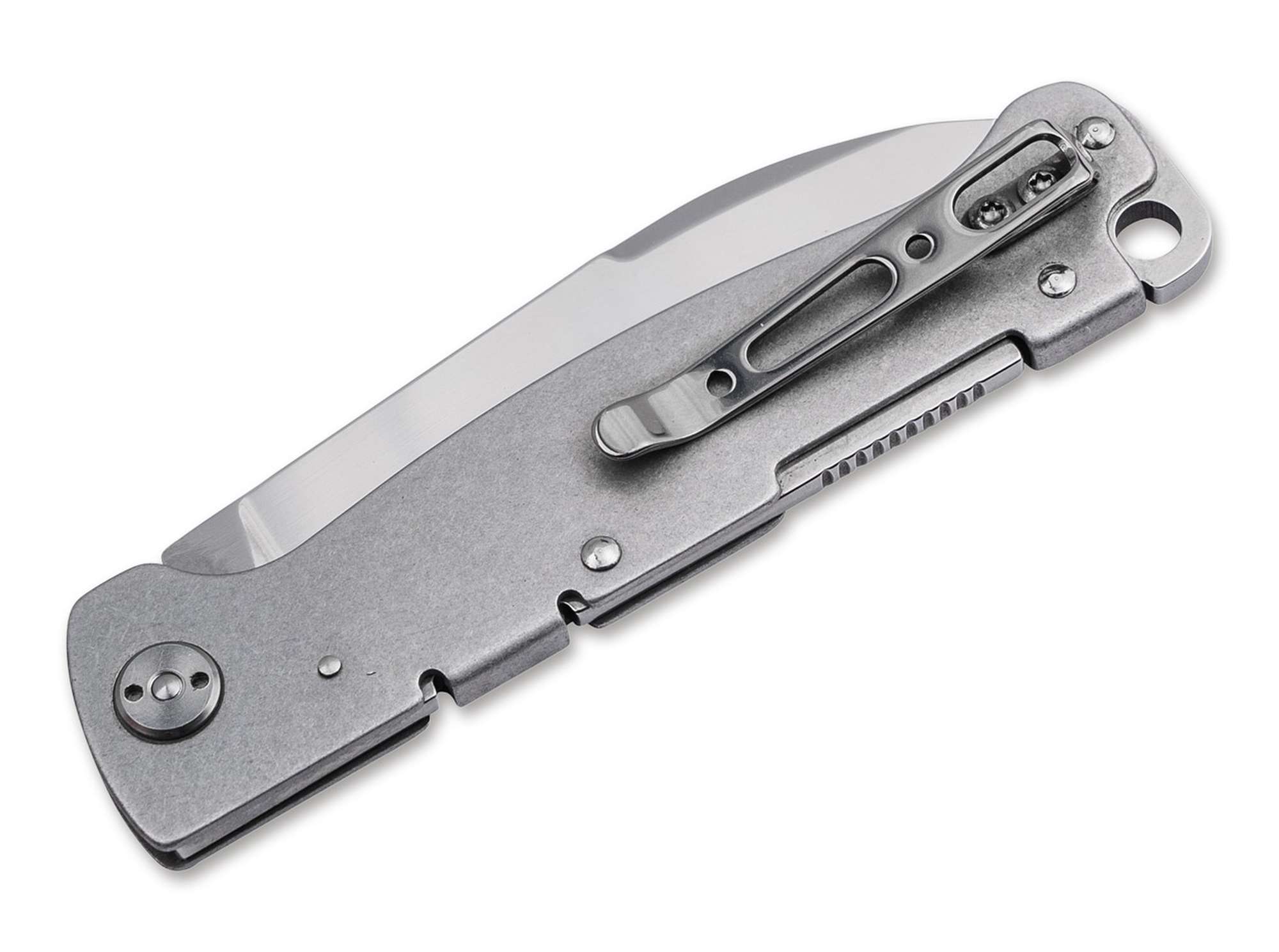 Das aufgeräumte Böker Plus Atlas ist ein zuverlässiges Taschenmesser mit einem Griffkörper aus Edelstahl, der in einem Stonewash-Finish gehalten ist. Die minimalistische Konstruktion ist überaus robust und macht das handliche Messer zum perfekten Begleiter in allen Lebenslagen. Die satinierte Droppoint-Klinge aus D2 wird per Nagelhau geöffnet, während die Verriegelung vom stabilen Back Lock übernommen wird. Das Messer hat einen Tip-Up Clip und eine Fangriemenöse.