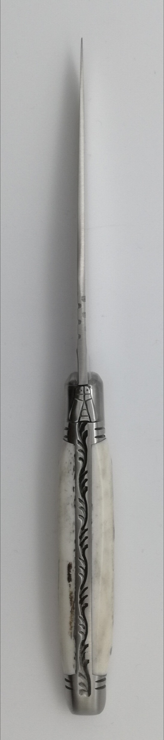Laguiole-Liebhaber werden die traditionellen Linien sowie die Biene und das Hirtenkreuz erkennen, die an der Legende des berühmten Messers teilnehmen. Die Klinge ist aus rostfreiem X46CR13 Stahl. Die Backen und die Klinge sind matt. Die Griffe sind aus Hirschhorn.