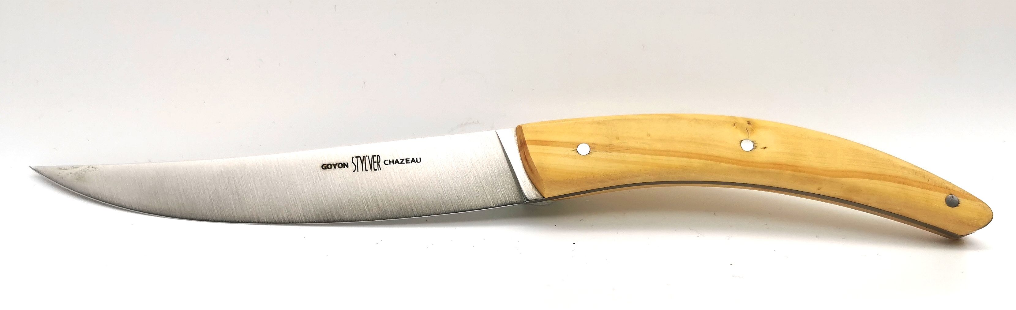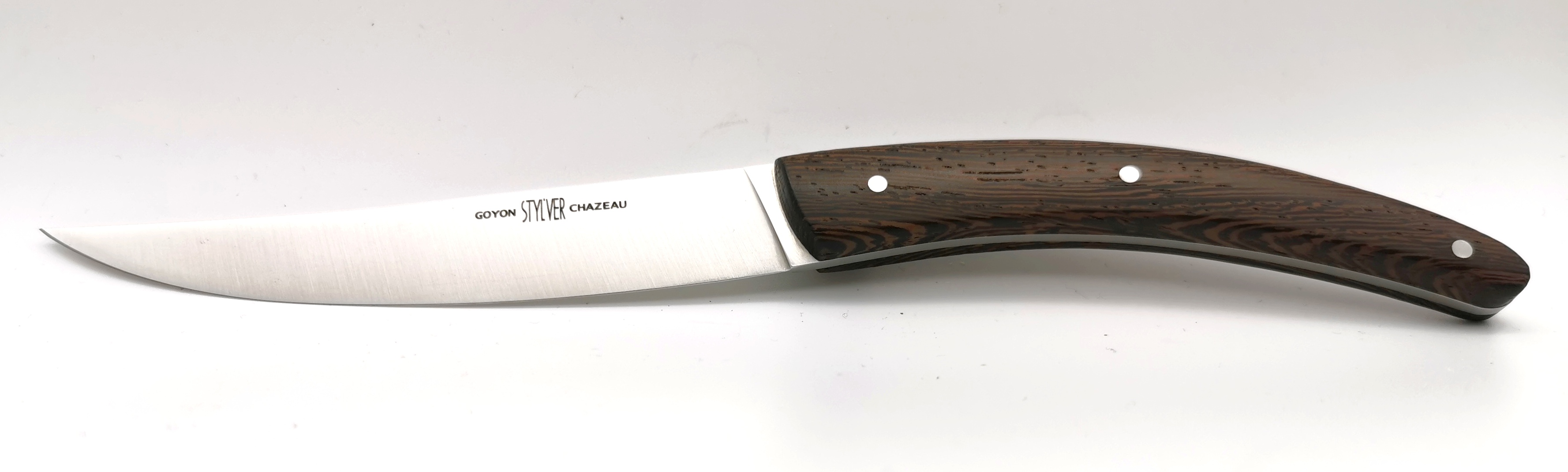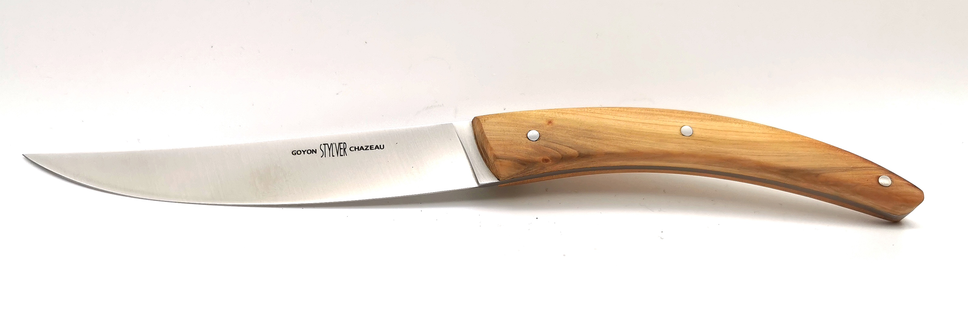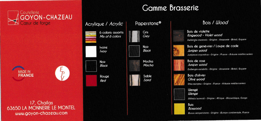 Die Serie Brasserie von Goyon Chazeau besticht durch ihre Einfachheit und Leichtigkeit. Die Form des Griffs ist inspiriert von der Kurve der Handfläche, für einen echten Komfort der Nutzung. Die Klinge ist aus schneidfreudigem, rostfreiem X46CR13 gefertigt. Das Finish ist matt.Die Griffe in diesem 6tlg. Set bestehen aus Wacholderholz, Olivenholz, Buchsbaumholz, Rosenholz, Veilchenholz und Wengenholz.