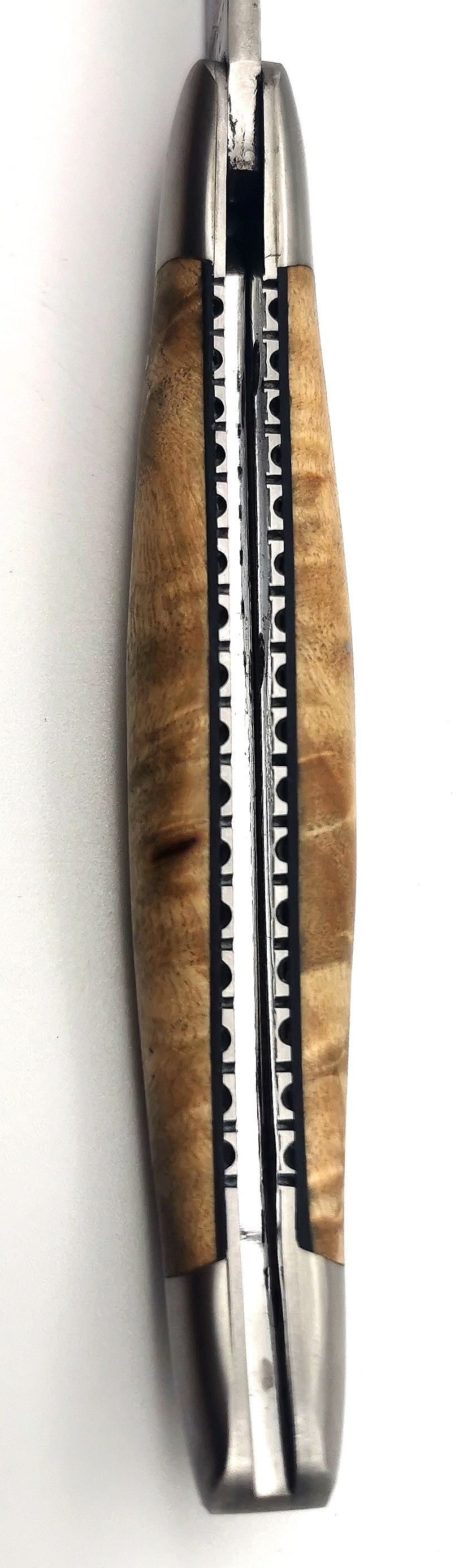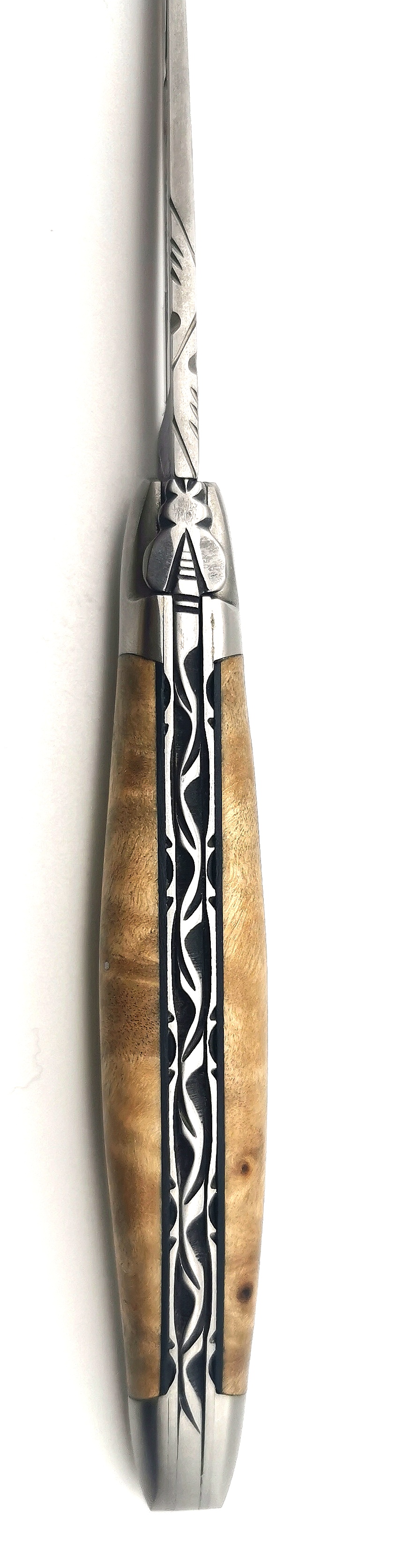 Laguiole mit Griffschalen aus Masurischer Birke. Das satinierte Finsh des Messers passt sehr gut zum Holz. Die Klinge ist aus 12C27 Sandvikstahl gefertigt, welcher für seine guten Schnitteigenschaften bekannt ist. Das Resort ist von Hand mit schöner Feilarbeit versehen. (Guillochage) Biene und Feder wurden aus einem Stück geschmiedet
