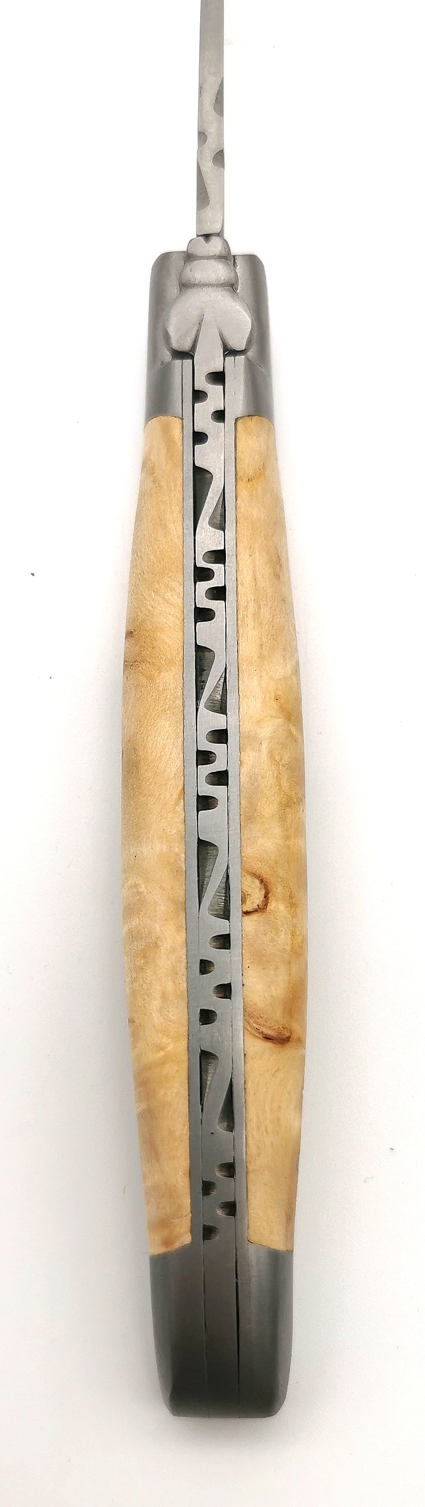 Dieses schöne Taschenmesser von Laguiole en Aubrac begeistert durch seine schönen Griffbeschalungen aus Birkenholz, was ein sehr lebhaftes Holz ist und dazu noch sehr hart. Das satinierte Finsh des Messers passt sehr gut zum stark gemaserten Holz.