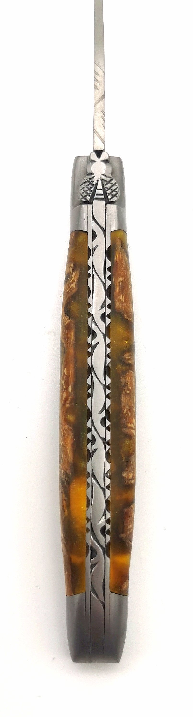 Das schöne Taschenmesser von Laguiole begeistert durch seine schönen Griffbeschalungen aus Kaktus. Die Beschalungen aus Kaktus werden mit einem Bernsteinfarbenen Epoxitharz stabilisiert, wodurch ein einzigartige Muster entsteht. Die Klinge wurde aus 12C27 Sandvik Stahl gefertigt. Dem Messer wurde ein poliertes Finish verliehen.