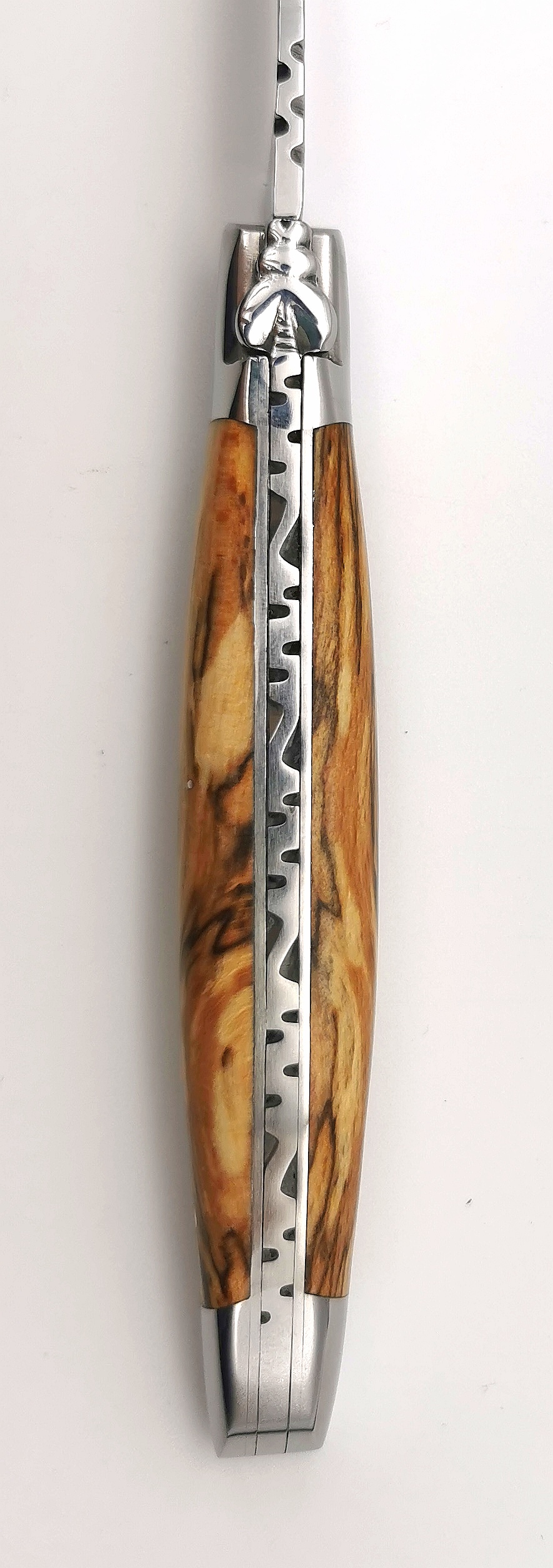 Dieses schöne Taschenmesser von Laguiole en Aubrac begeistert durch seine schönen Griffbeschalungen aus Aubrac Buchenholz (vom Aubrac Hochplateau). Das Buchenholz ist gestockt und stabilisiert, wodurch eine wunderschöne Maserung und gleichzeitig eine hohe Widerstandsfähigkeit gegen Stöße und Feuchtigkeit erreicht wird.