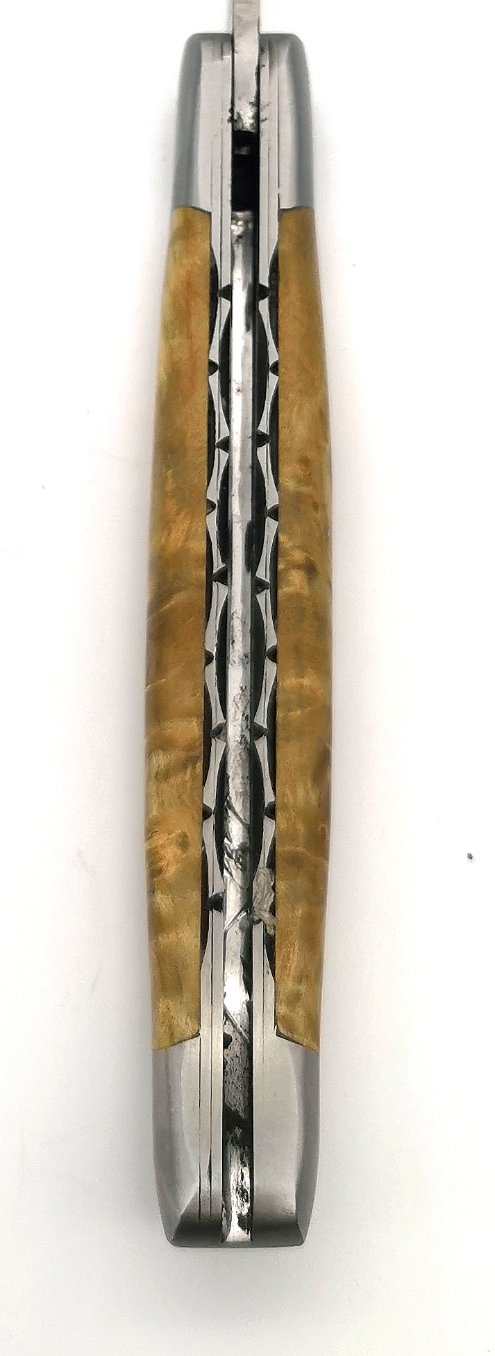 Besonders hervorzuheben an diesem Messer sind die Griffbeschalungen aus wunderschön gemasertem Rosskastanien Holz. Die Klinge wurde aus 12C27 Sandvik Stahl gefertigt. Dem Messer wurde ein poliertes finish verliehen.