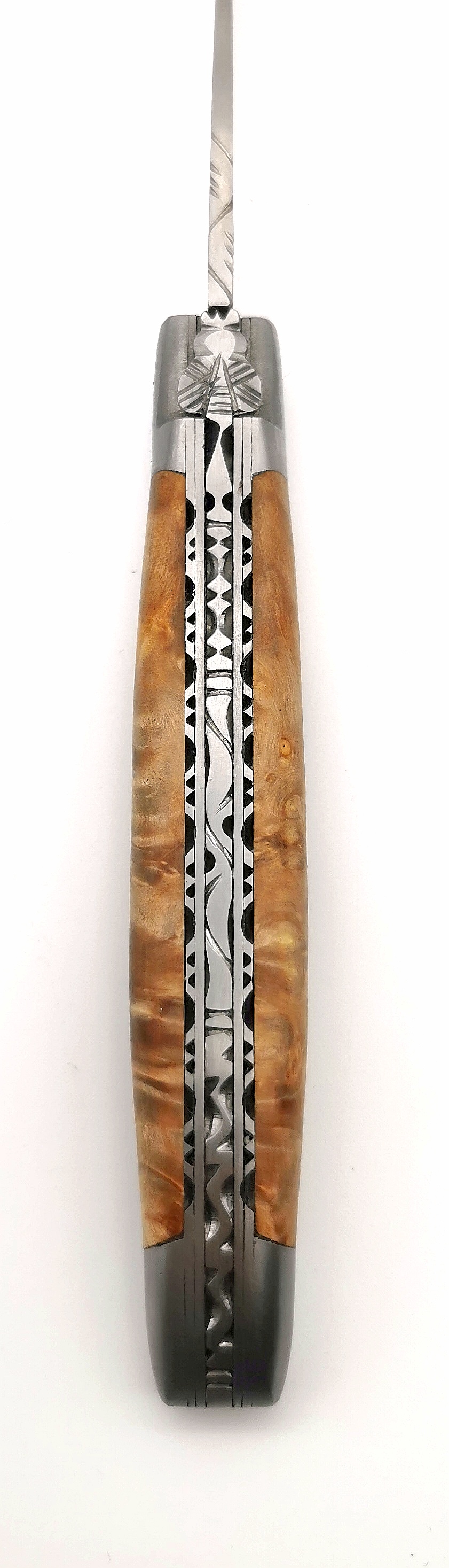 Ein klassisches Laguiole Messer mit aufwendig verzierter Doppelplatine. Anstatt der üblichen einen Platine werden hier zwei Platinen verarbeitet. Dies trägt zu einer noch besseren Stabilität bei. Der Griff wird dadurch etwas breiter und das Messer im gesamten etwas schwerer.