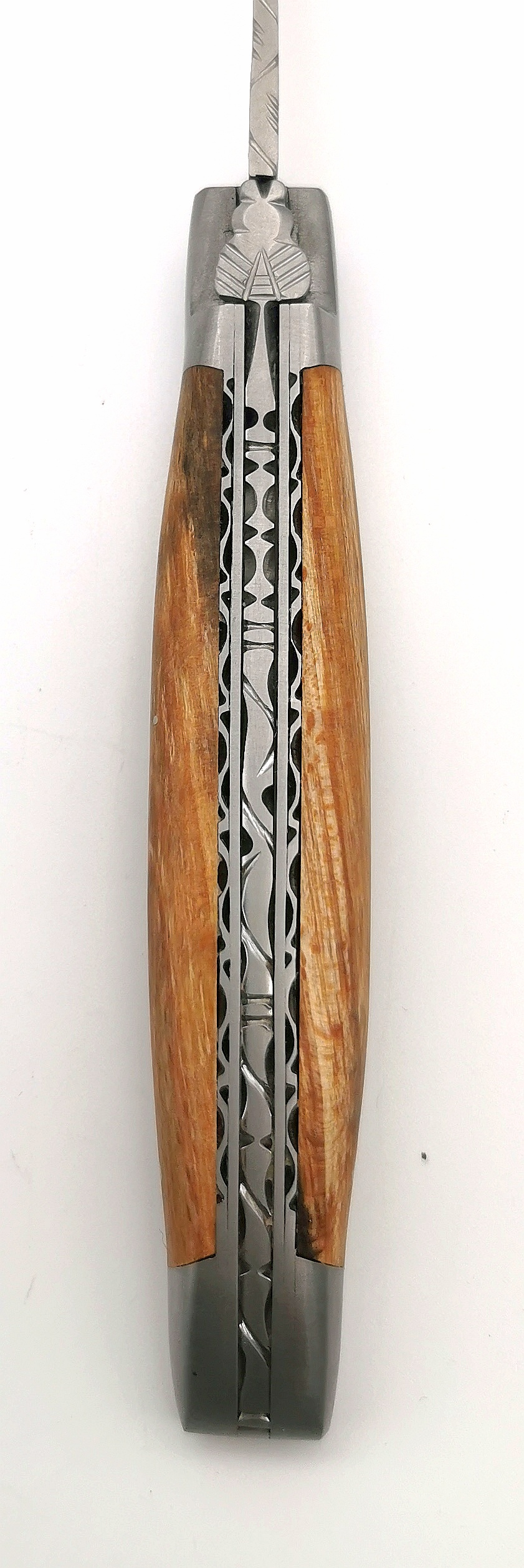 Ein klassisches Laguiole Messer mit aufwendig verzierter Doppelplatine. Anstatt der üblichen einen Platine werden hier zwei Platinen verarbeitet. Dies trägt zu einer noch besseren Stabilität bei. Der Griff wird dadurch etwas breiter und das Messer im gesamten etwas schwerer.