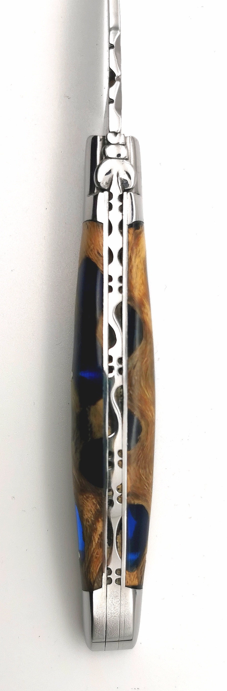 Das schöne Taschenmesser von Laguiole begeistert durch seine schönen Griffbeschalungen aus Kaktus. Die Beschalungen aus Kaktus werden mit einem blauen Epoxitharz stabilisiert, wodurch ein einzigartige Muster entsteht. Die Klinge wurde aus 12C27 Sandvik Stahl gefertigt. Dem Messer wurde ein poliertes Finish verliehen.