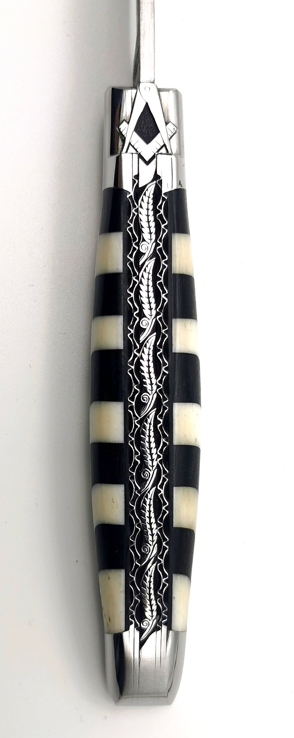 Das schöne Taschenmesser von Laguiole begeistert durch seine ausergewöhnlichen Griffbeschalungen mit einem Mosaik aus Knochen und Ebenholz.Die beiden Materialien bilden ein wunderschönes Muster.
