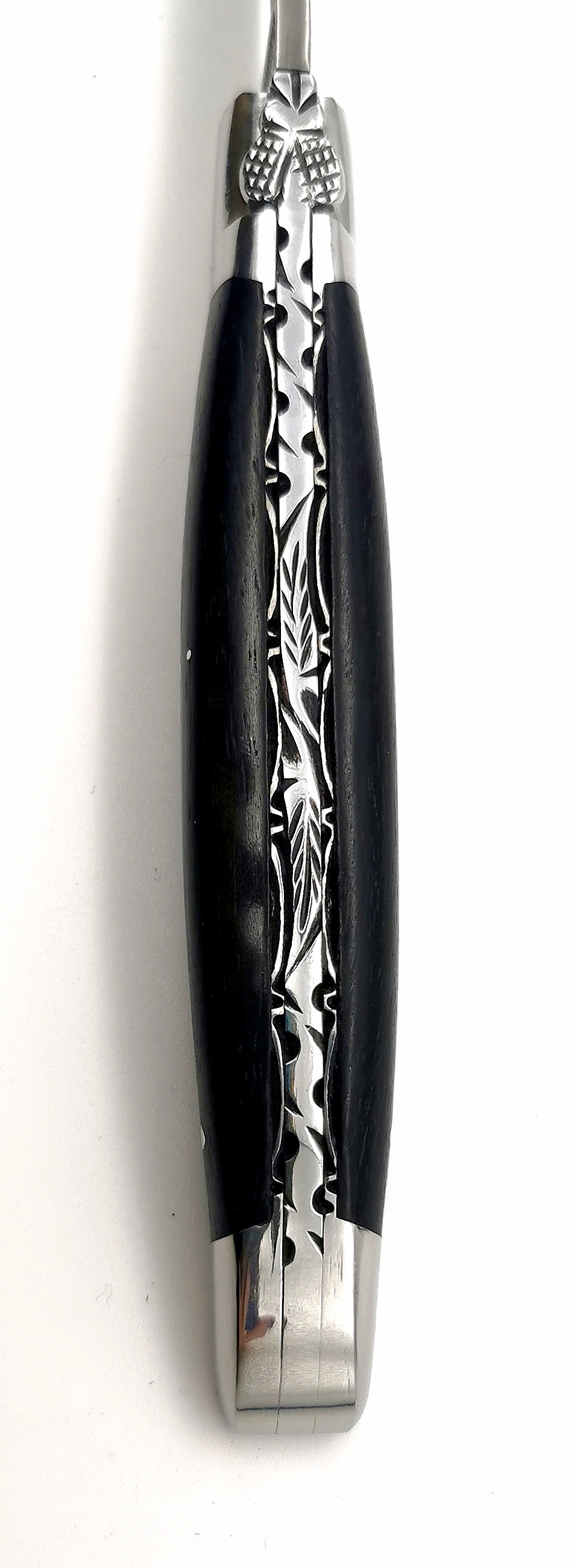 Das schöne Taschenmesser von Laguiole en Aubrac begeistert durch seine schönen Griffbeschalungen aus Ebenholz. Das Holz ist stabilisiert was zu einer hohe Widerstandsfähigkeit gegen Stöße und Feuchtigkeit führt. Die Feder und Platine wurde von Hand mit einer wunderschönen Feilarbeit versehen (Guillochage).Biene und Feder wurden aus einem Stück geschmiedet. Die Klinge ist aus Balbach Damast gefertigt, welcher für seine hohe Qualität und beeindruckenden Musterungen bekannt ist.