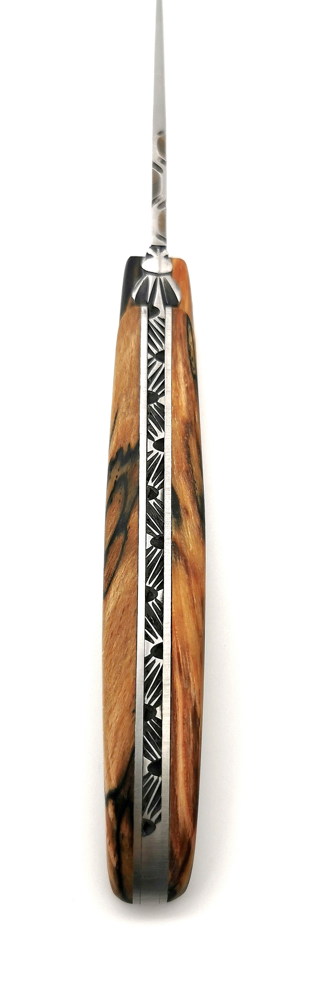 Dieses schöne Taschenmesser von Laguiole Village begeistert durch seine schönen Griffbeschalungen aus Aubrac Buchenholz. Das Buchenholz ist gestockt und stabilisiert, wodurch eine wunderschöne Maserung und gleichzeitig eine hohe Widerstandsfähigkeit gegen Stöße und Feuchtigkeit erreicht wird.Die Klinge ist aus 14C28N gefertigt, welcher für seine guten Schnitteigenschaften bekannt ist. Das Feder ist von Hand mit schöner Feilarbeit im Sonnenscheinstil versehen. (Guillochage) Biene und Feder wurden aus einem Stück geschmiedet