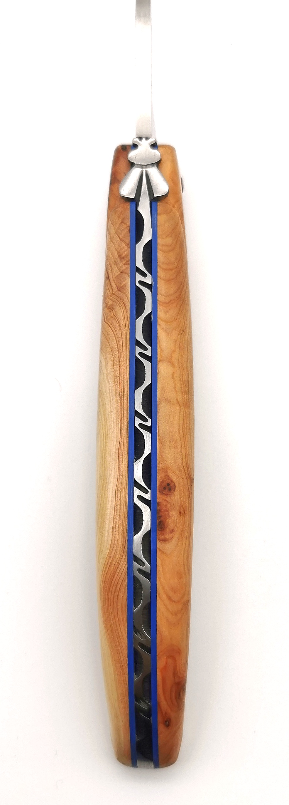 Das schöne Taschenmesser von Laguiole Village begeistert durch seine schönen Griffbeschalungen aus Wacholderholz. Das Holz mit einer wunderschöne Maserung ist stabilisiert was zu einer hohe Widerstandsfähigkeit gegen Stöße und Feuchtigkeit führt. Die Feder wurde von Hand mit einer wunderschönen Feilarbeit (Guillochage) versehen , was durch die blau unterlegten Beschalungen optisch unterstützt wird. Biene und Feder wurden aus einem Stück geschmiedet. Die Klinge ist aus 14C28N Stahl gefertigt, welcher für seine guten Schnitteigenschaften bekannt ist.