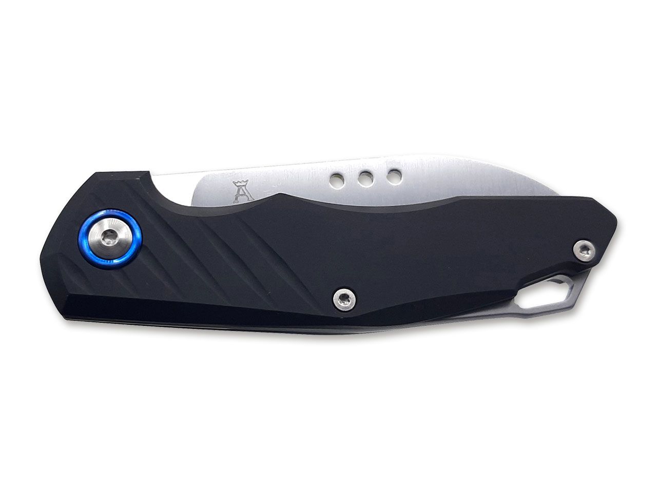 Das klassische Slipjoint-Taschenmesser verfügt über eine schnitthaltige Klinge aus M390 und wird mittels dreier kleiner Löcher in der Klinge geöffnet. Der schwarze Griff aus Aluminium ist ergonomisch geformt und mit einer Fangriemenöse versehen.