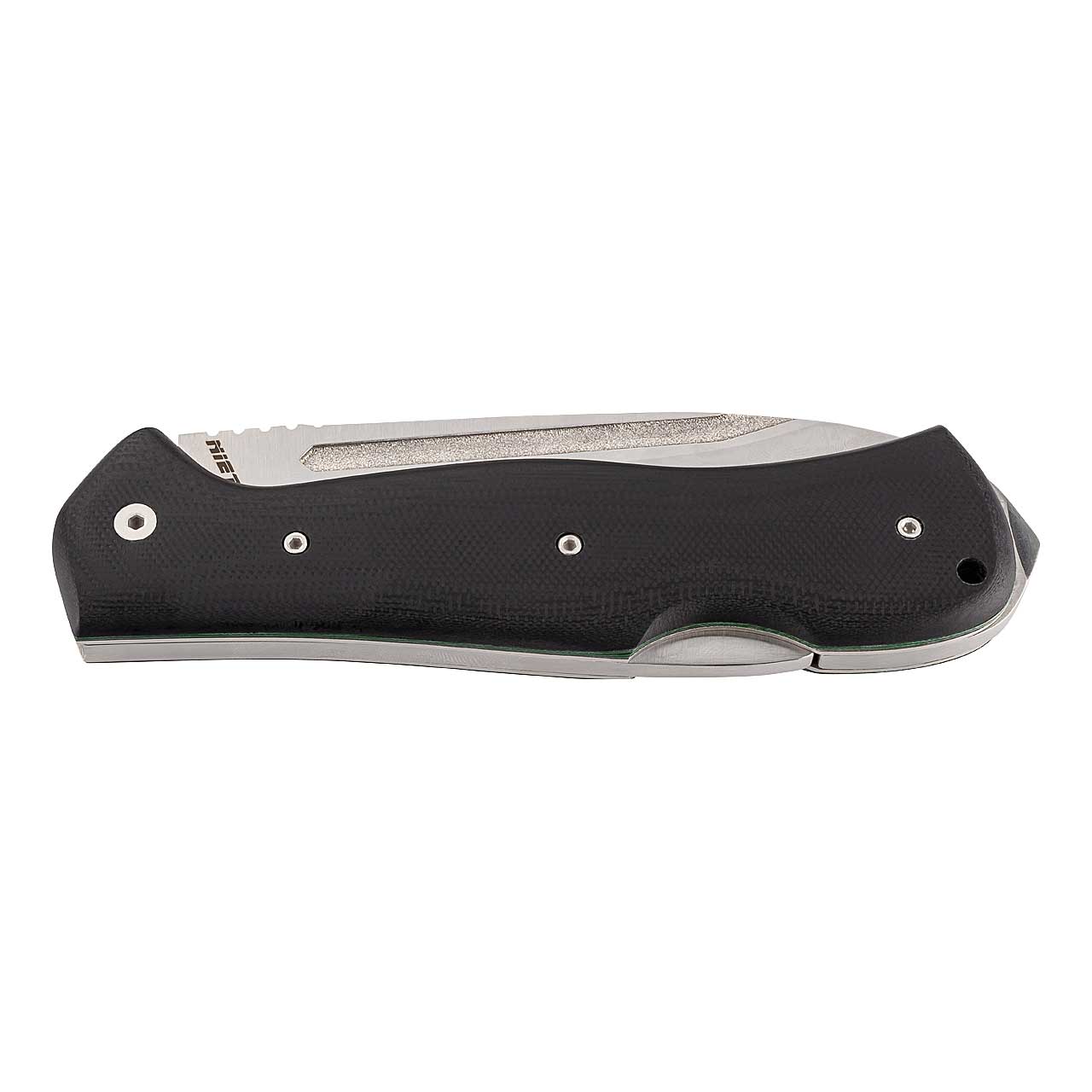Die kräftige Drop Point Klinge des Centauro aus rostfreiem Böhler N695 Hochleistungsstahl ist am Klingenrücken mit einer praktischen Daumenriffelung versehen. Ein starker Back Lock Mechanismus arretiert die Klinge zuverlässig. Die auf mattierte Edelstahlplatinen verschraubten Griffschalen aus schwarzem G10 sind mit einer grünen Fiberglaslage unterlegt. Am Ende des ergonomischen Griffs befinden sich eine Fangriemenöse sowie ein Schlagdorn. Ein tolles stabiles Messer das perfekt für die Arbeit ist.