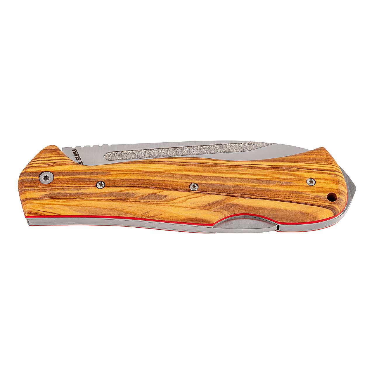 Die kräftige Drop Point Klinge des Centauro aus rostfreiem Böhler N695 Hochleistungsstahl ist am Klingenrücken mit einer praktischen Daumenriffelung versehen. Ein starker Back Lock Mechanismus arretiert die Klinge zuverlässig. Die auf mattierte Edelstahlplatinen verschraubten Griffschalen aus Olivenholz sind mit einer roten Fiberglaslage unterlegt. Am Ende des ergonomischen Griffs befinden sich eine Fangriemenöse sowie ein Schlagdorn. Ein tolles stabiles Messer das perfekt für die Arbeit ist.