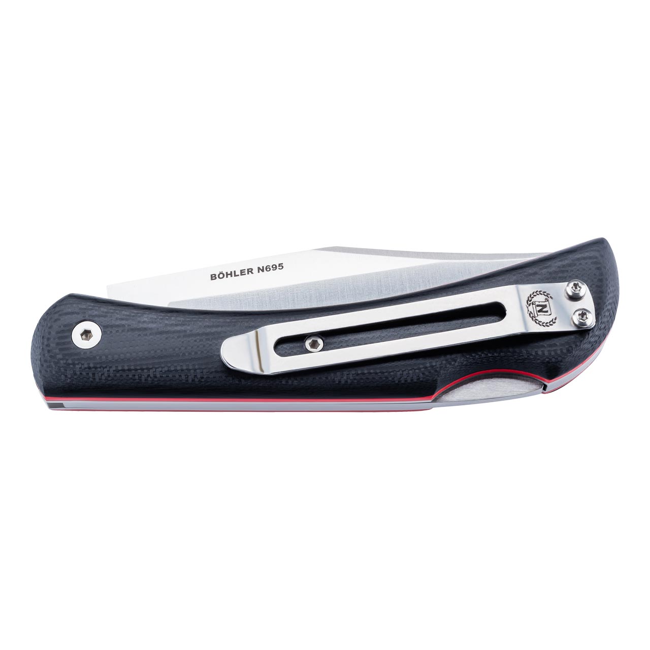 Das Comando ist ein klassisches Taschenmesser mit modernen, hochwertigen Materialien. Die satinierte Hechtklinge aus Böhler N695 Hochleistungsstahl wird im geöffneten Zustand von einem Back Lock Mechanismus zuverlässig arretiert.Der sauber verarbeitete Griff besteht aus Edelstahlplatinen, rote Fiberglas-Liner und schwarzen G10 Heftschalen. Der Tip Up Clip aus satiniertem Edelstahl kann rechts oder links montiert werden.