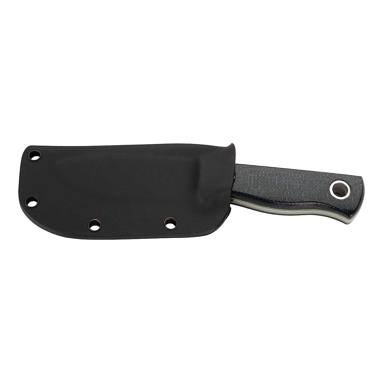 Klein, aber dennoch äußerst robust. So präsentiert sich das YESCA MINI Gürtelmesser vom spanischen Hersteller Nieto. Die flachgeschliffene Drop Point Klinge in Full Tang Bauweise wird aus rostfreiem Vanadium 1.4116 Hochleistungsstahl hergestellt. Die Griffschalen aus Sackleinen-Micarta liegen auf einer grünen Fiberglaslage und werden durch ausgefallene Hohlnieten fest am Griff fixiert. Eine passgenaue Scheide aus schwarzem Kydex vervollständigt die Ausstattung.