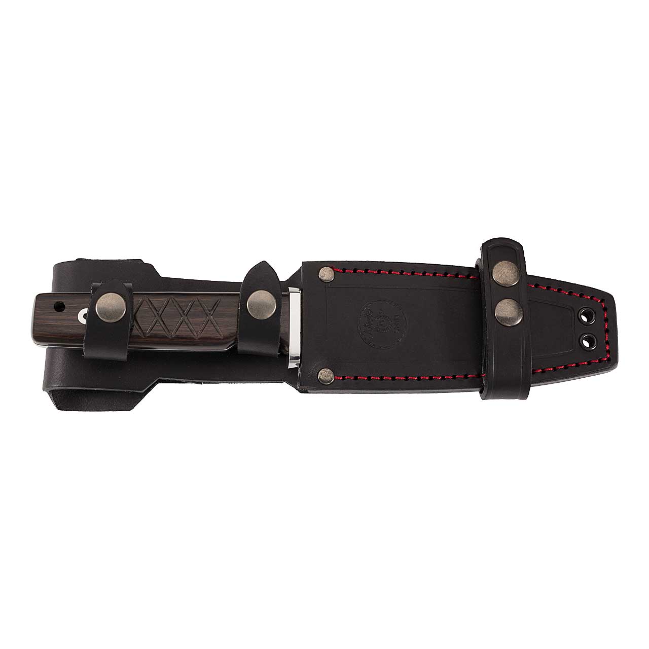 Der spanische Hersteller Nieto präsentiert mit dem Modell Mustang ein elegantes, aber dennoch kräftiges Gürtelmesser. Die Drop-Point Klinge wird aus rostfreiem AN.58 Stahl in Full Tang Bauweise gefertigt. Ein hochglanzpoliertes Edelstahl-Parierelement schützt zuverlässig vor einem Abrutschen in die Klinge. Das großzügig dimensionierte Heft ist aus Grenadill Holz. Passend dazu gibt es eine längs oder quer zu tragende Scheide aus schwarzem Leder.