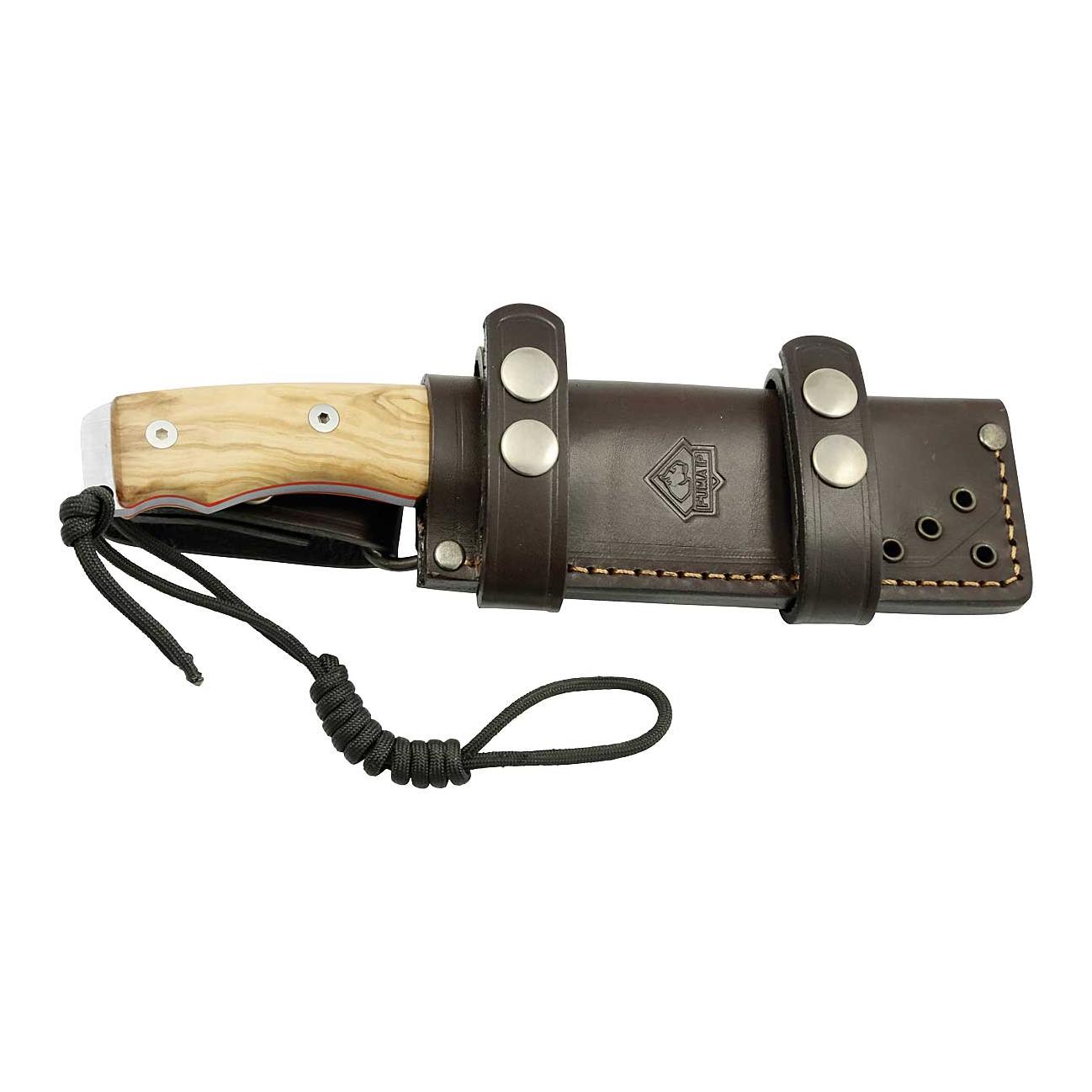 Das Puma IP Gürtelmesser SAVAGE OLIVE ist ein extrem robustes Outdoormesser in Full Tang Bauweise. Die 5 mm starke Drop Point Klinge aus rostfreiem 1.4116 Stahl verfügt über eine geriffelte Daumenauflage und eine Vertiefung zum Einsatz eines Feuerstahls. Die Griffschalen aus Olivenholz liegen auf einer roten Fiberglaslage und werden durch drei Schrauben gesichert. Das Griffende kann notfalls als Hammer genutzt werden und verfügt über eine Fangriemenöse. Die aufwendig gefertigte Scheide aus braunem Leder kann längs, quer oder hängend am Gürtel oder Rucksack getragen werden.